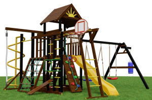 Игровая башня с деревянной крышей, пластиковый скат, рукоход, турник, песочница с лавочкой и спинкой, качели Гнездо, прямые качели, горная стенка с канатом, баскетбольный щит с сеткой, шведская станка двойная, веревочная лестница и др.